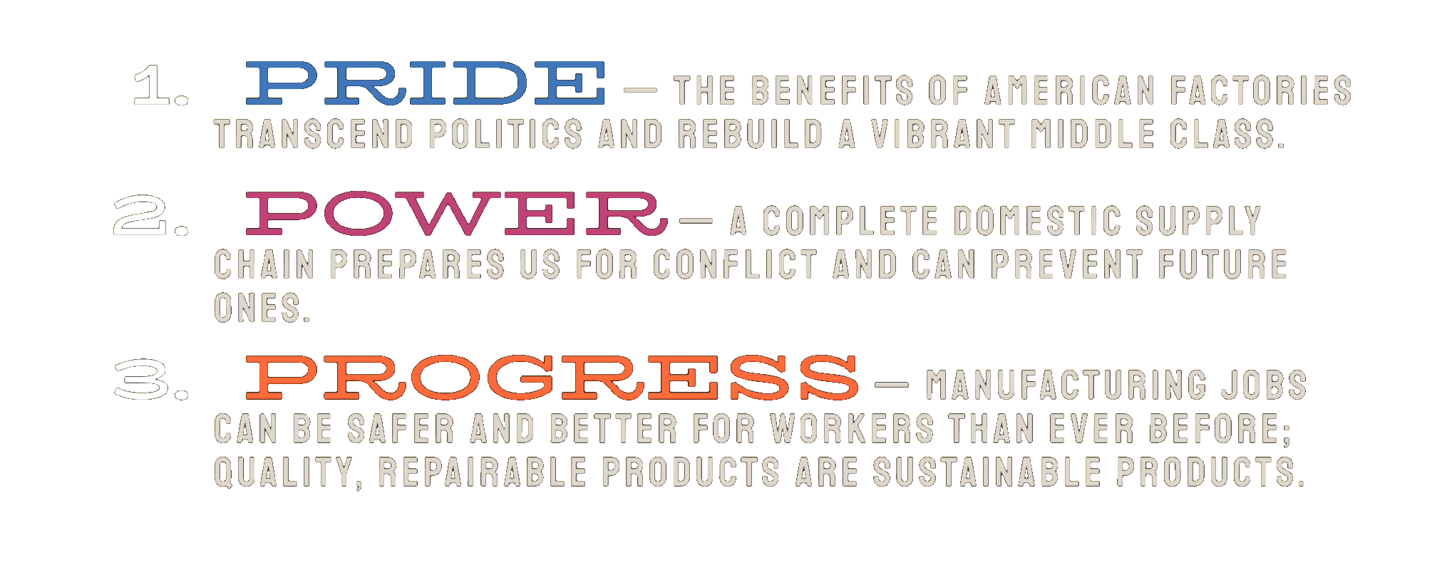 Reindustrialization strengthens America's economic, technological, and cultural foundations—and rebuilds the middle class that made this country great.
